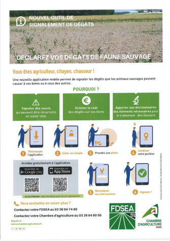 L’application "Signaler dégâts faune sauvage" permet aux agriculteurs et aux particuliers d'alerter gratuitement dès qu'un animal sauvage, quel qu'il soit, provoque des dégâts (hors sangliers, chevreuils et cervidés :